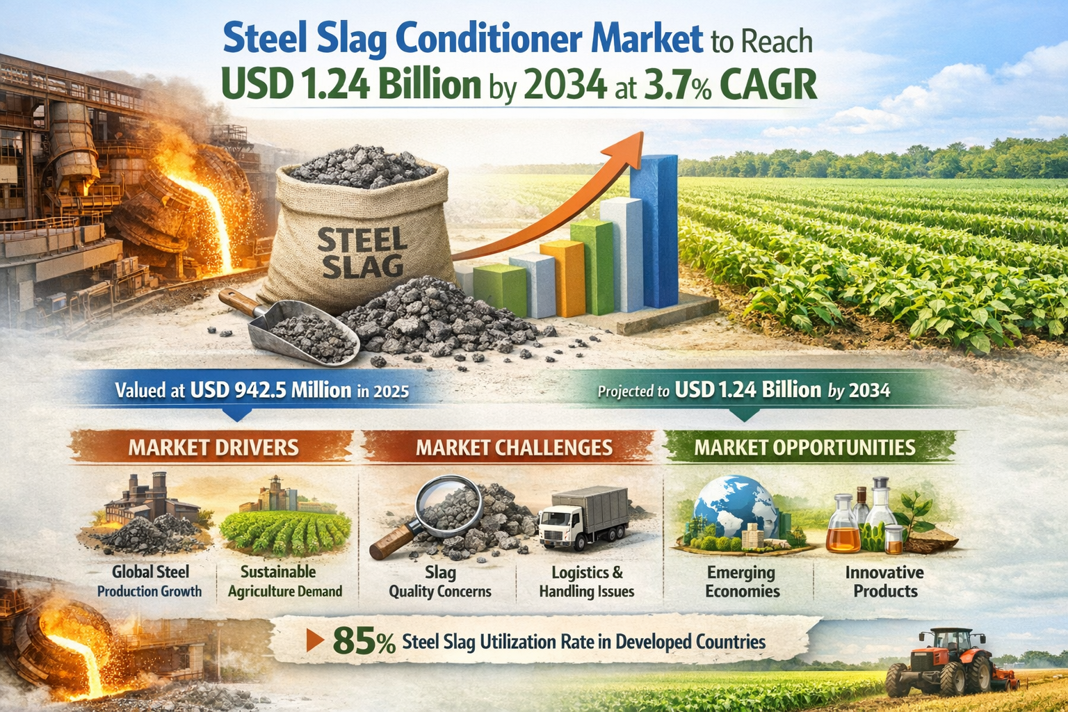 Steel Slag Conditioner Market to Reach USD 1.24 Billion by 2034 at 3.7% CAGR